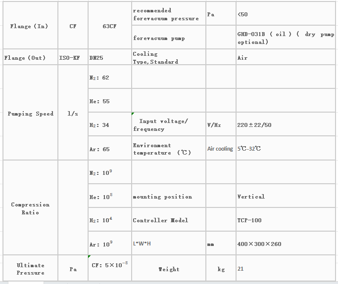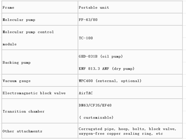 本規范中的產品包括FJ-80,渦輪泵站,相應的抽速為62L/s。前級油泵的抽速為0.5L/s,前級干泵的抽速為0.2L。